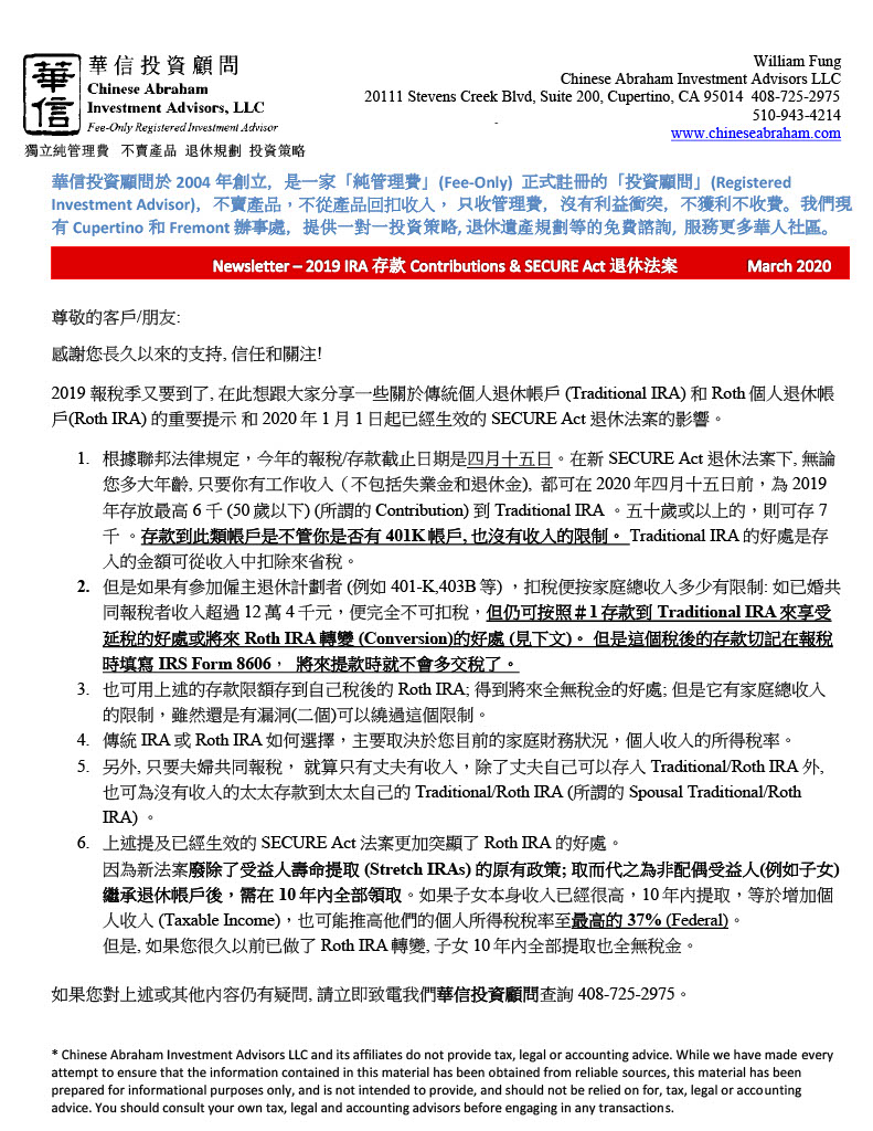 Newsletter > 2019 IRA 存款 Contributions & SECURE Act 退休法案