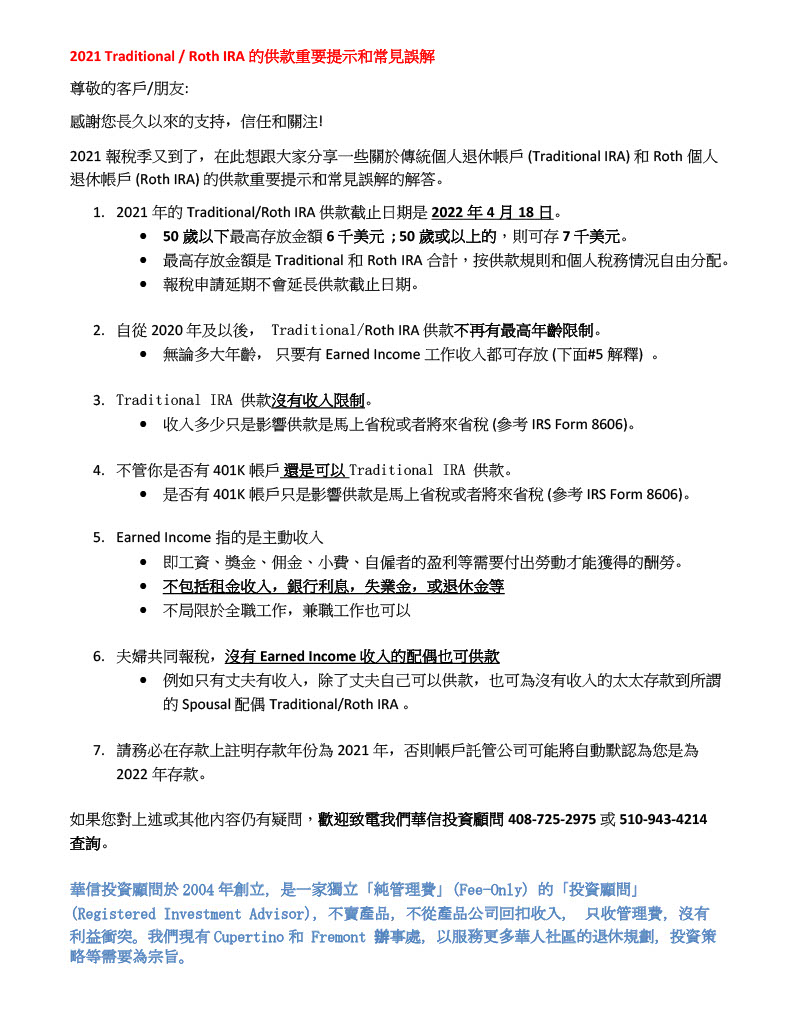 Newsletter > 2021 Traditional & Roth IRA 的供款重要提示和常見誤解